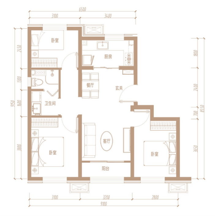 约89㎡ | 三室两厅一卫